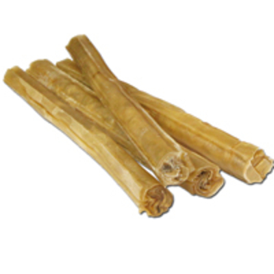 Aus gerollter und gepresster Rinderhaut. Verwendet wird die Unterhaut von Rindern. Während die Oberhaut zu (Spalt-) Leder verarbeitet und zur Weiterverarbeitung in alle Welt exportiert wird, ist die gegerbte Unterhaut ein wirklich zäher Knabberspaß für alle Vierbeiner mit kräftigen und gesunden Zähnen. Angst vor Krankheitserregern oder mangelnder Hygiene braucht man dabei nicht zu haben, denn durch die zahlreichen Arbeitsschritte von Gerben und Erhitzen, Pressen und Trocknen wird das Produkt so steril, wie kaum ein anderes Naturprodukt. Rinderhaut wird aufgerollt und in Knochenform gepresst (besonders hart), oder nur getrocknet (weichere Knotenknochen und Kauschuhe), oder granuliert und dann gepresst (recht weich) angeboten. Länge: ca. 25 cm, ca. 2, 5 cm dick Als Faustregel