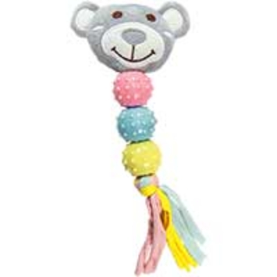 Feines, kleines Hundespielzeuge für Welpen und kleine Rassen. Aus Plüsch mit sauber aufgesticktem Gesicht. Mit drei Bällen aus gummiähnlichem TPR an einer Kordel aus Stretchstoff und mit einem leisen Quietscher. Ein ideales Beschäftigungs-Spielzeuge für alle kleinen Vierbeiner! Bei 30°C waschbar. Größe: ca. 21 x 9 cm
